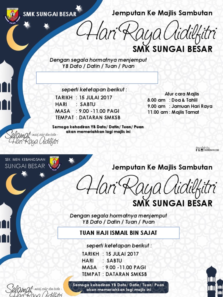 Use the download button below or simple online reader. Jawatankuasa pibg sk padang gajah dengan rasa sukacitanya menjemput tuan/puan pengurus ladang allagar …. Sukacita dimaklumkan bahawa, psukm akan menganjurkan jamuan hari raya aidilfitri psukm pada 13 julai 2018 (jumaat), jam 2.30 sehubungan dengan itu, pihak mpp psukm dengan berbesar hati menjemput semua rakan (ahli dan ahli bersekutu) untuk hadir memeriahkan jamuan hari raya ini. Template kad raya yang dibuat khas untuk dijadikan kad ucapan online. Kami dengan sukacitanya mempersilakan tuan/puan/encik & cik ahmad afendi ismail serta seisi keluarga ke majlis jamuan akhir tahun 2015 tarikh : Dewan terbuka smk bakai tema pakaian. Jamuan raya sesi petang skss 2015. Designing simple invitation card (kad jemputan: Home » design » moshims kad jemputan jamuan. Jemputan ke ke jemputan jamuanhari hariraya raya jamuan. Contoh kertas kerja jamuan hari raya.docx. Sweet kad is the perfect option for you because our team of jemputanmalaysia designers work hard to create best #kadkahwinprinting that are original and diverse. Download lagu kad jemputan (11.9mb) dan streaming kumpulan lagu kad jemputan (11.9mb) mp3 terbaru di metrolagu dan nikmati, video klip kad jemputan mp4, lirik lagu kad jemputan full album.
